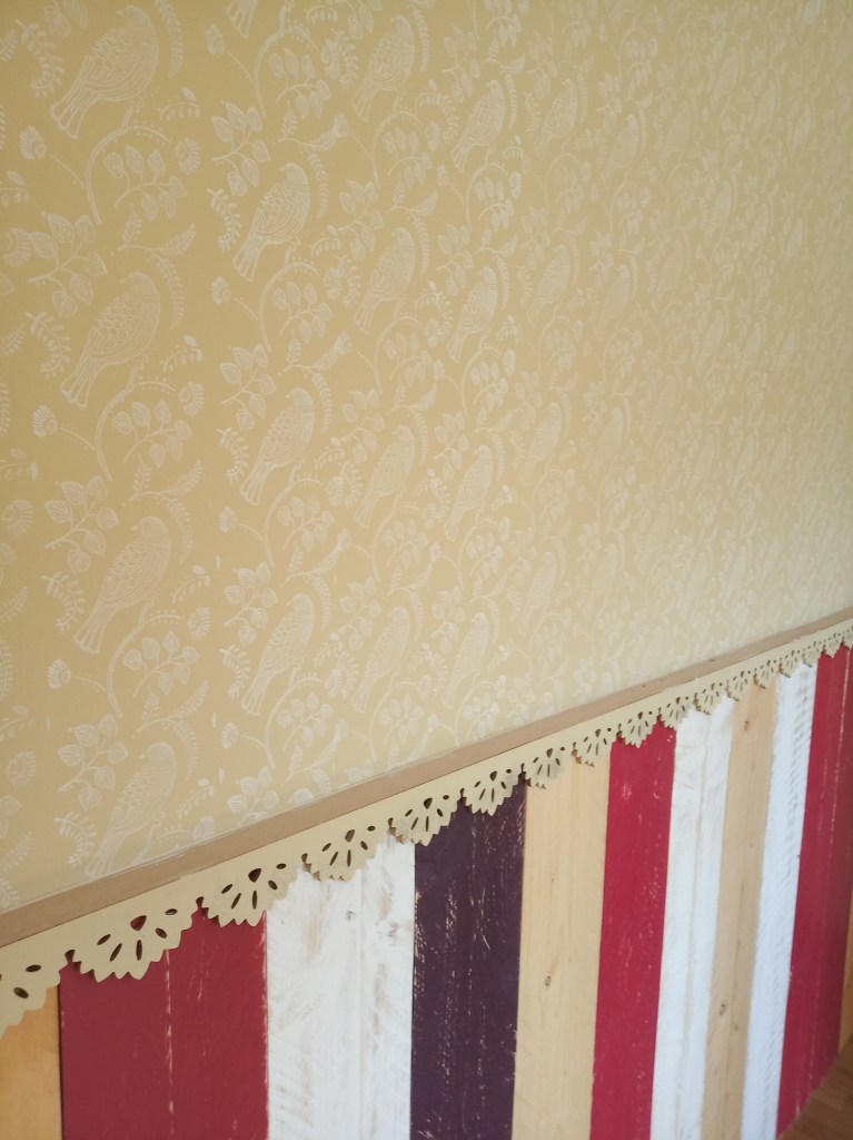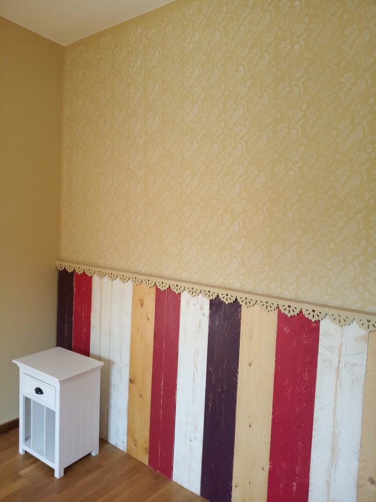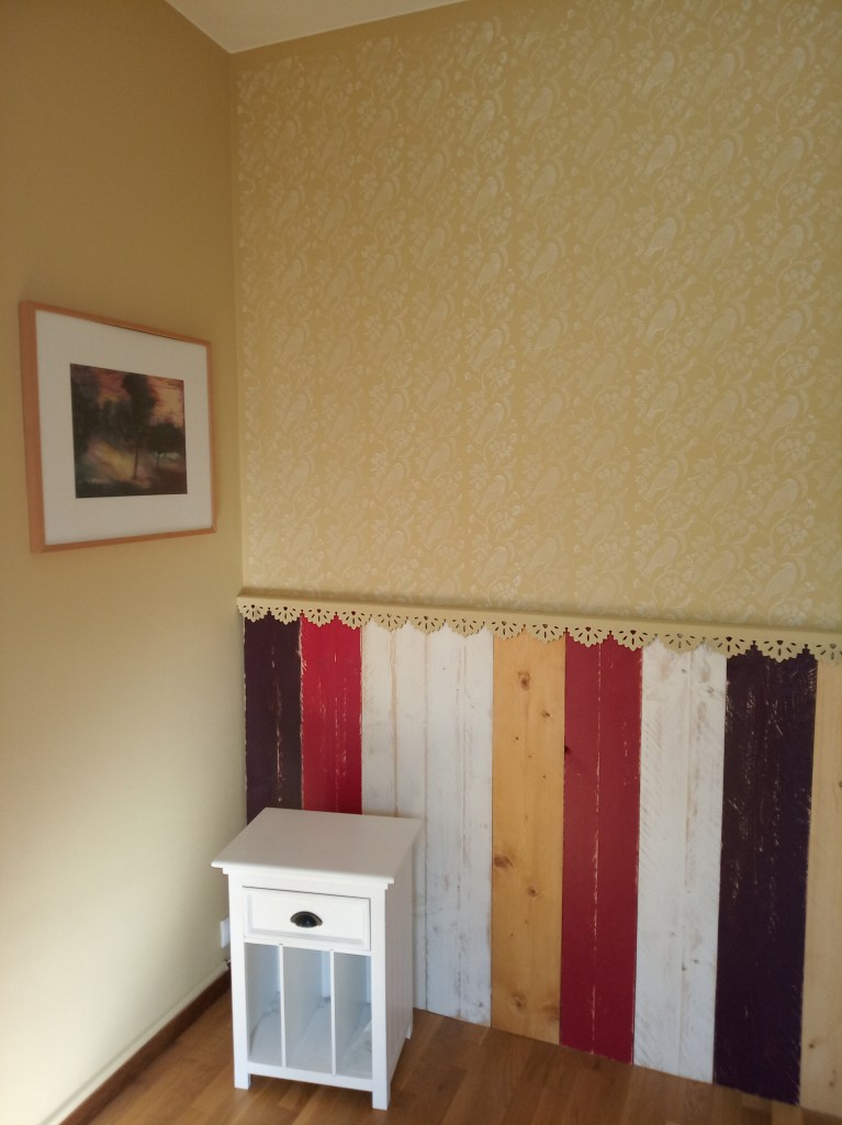 Mur décor peint acrylique et réalisation de l’abat jour en papier et tissus.