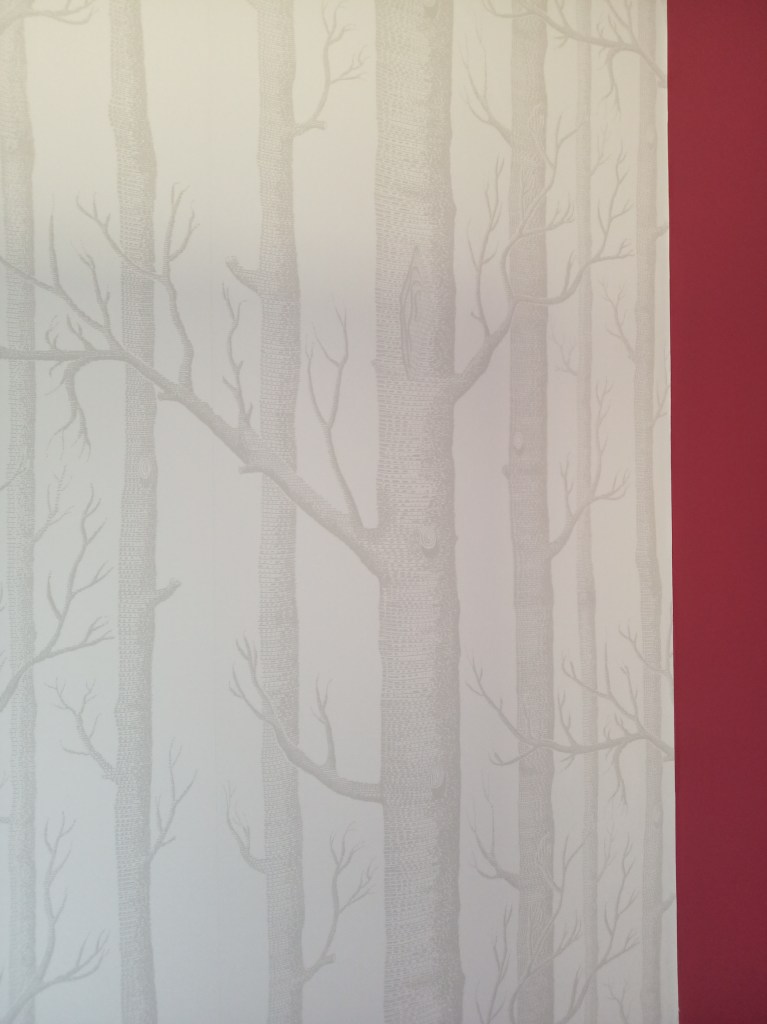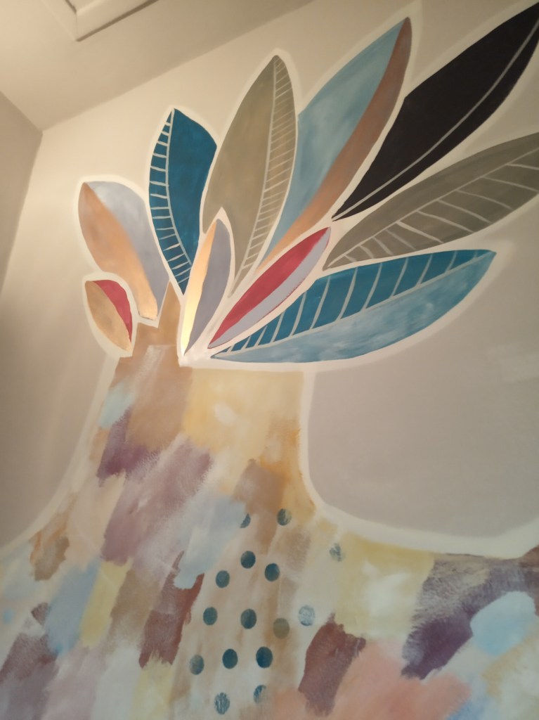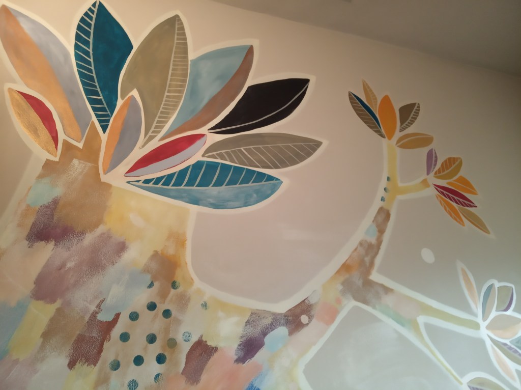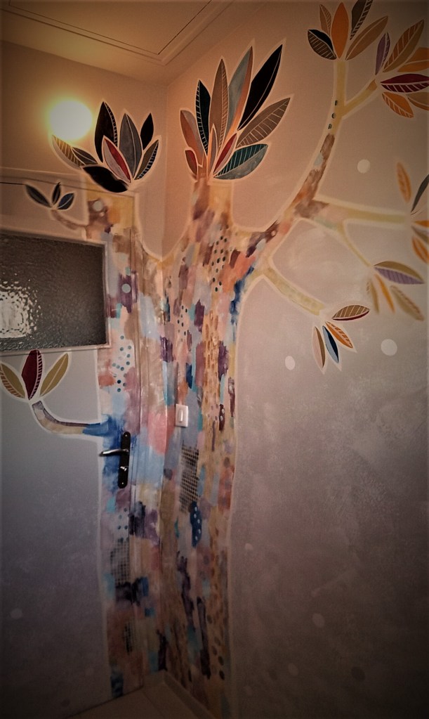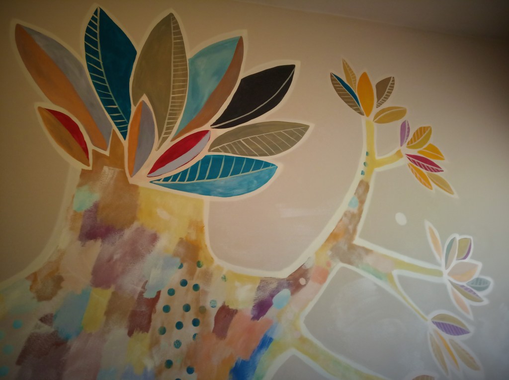 Détail décor peint enfant « arbre aux oiseux » acrylique.